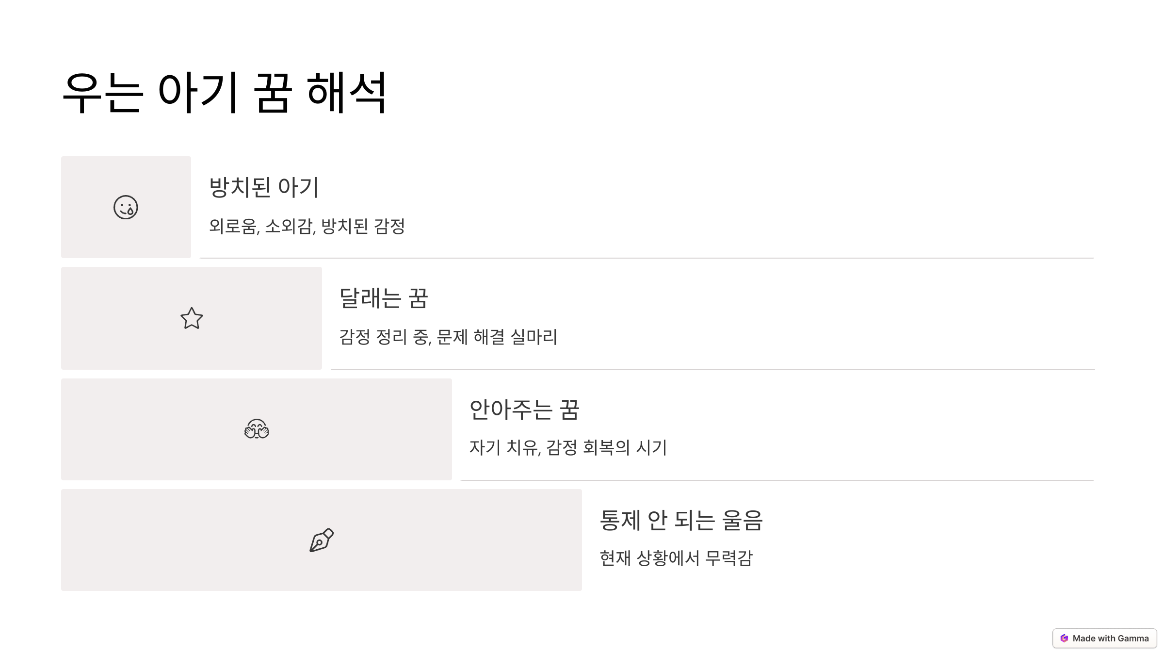 특히 현실에서 ‘표현하지 못한 감정’, ‘해결되지 않은 불안’이 있는 경우, 아기의 울음으로 드러나는 경우가 많아요.