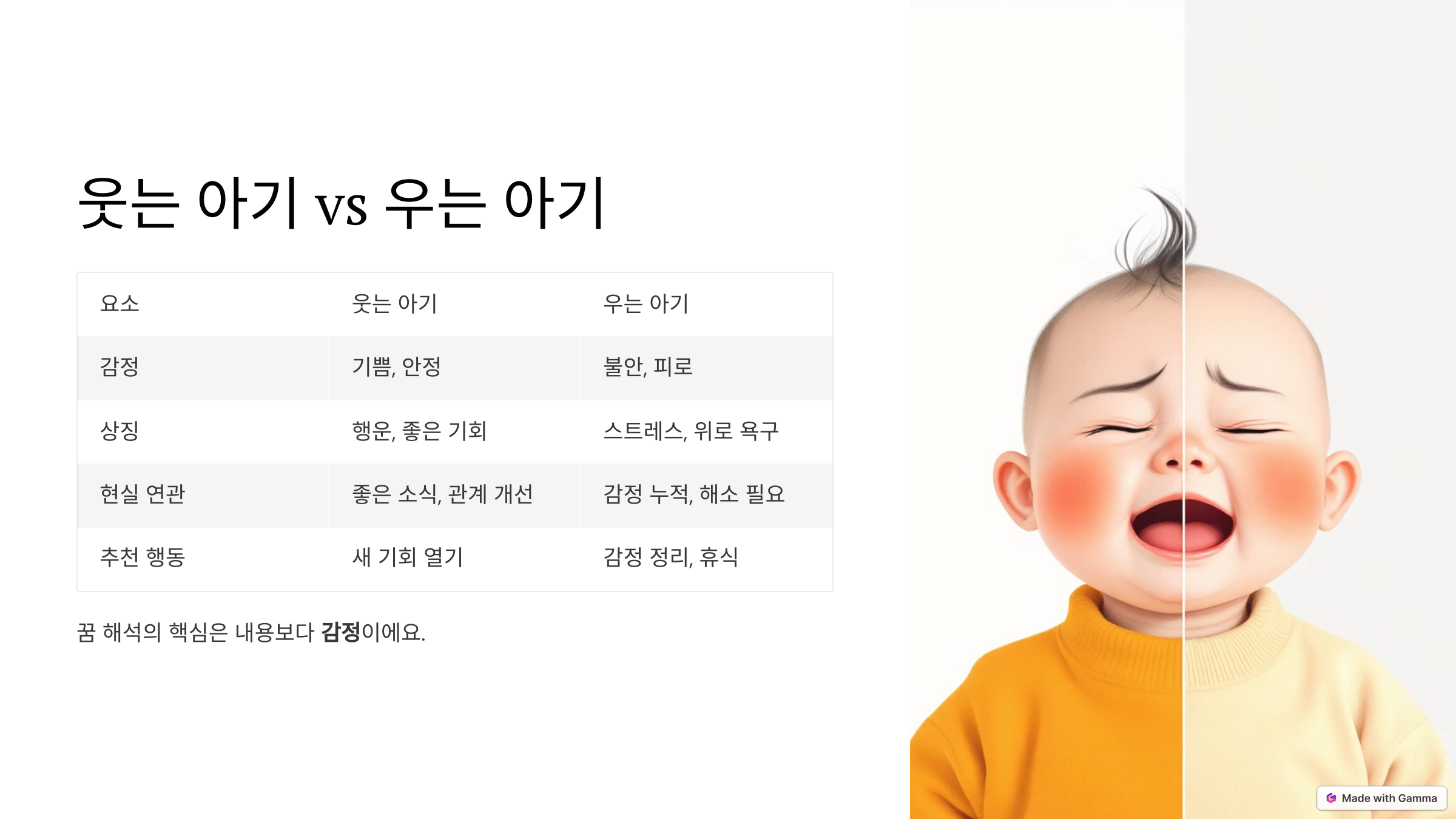 같은 아기라도 꿈속에서 내가 어떤 감정을 느꼈는지에 따라 완전히 다른 의미를 가질 수 있습니다.