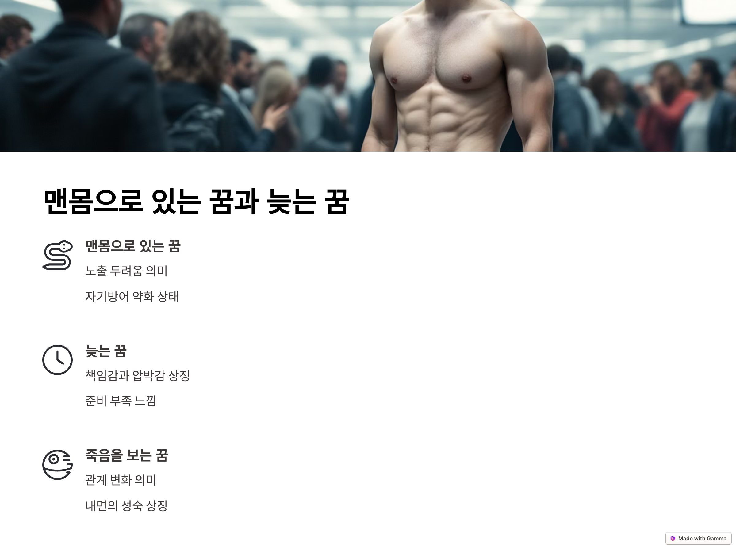자신이 무방비 상태라고 느끼거나, 타인에게 내 민낯을 보여줘야 하는 상황일 때 자주 꾸는 꿈입니다.