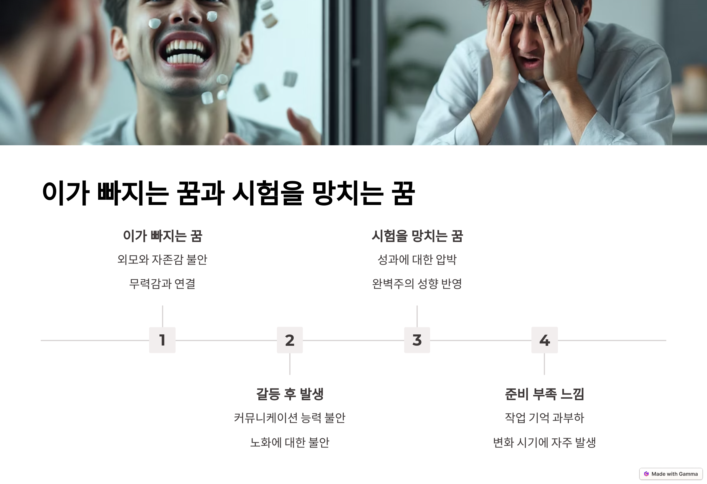 과학적으로도 이런 꿈은 작업 기억의 과부하나 자기 효능감 저하 상태에서 더 자주 나타난다고 알려져 있어요.